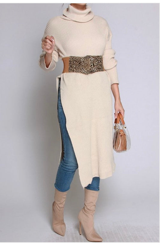 Turtle neck sweater with side splits one side high the other low . stretch . belt not...