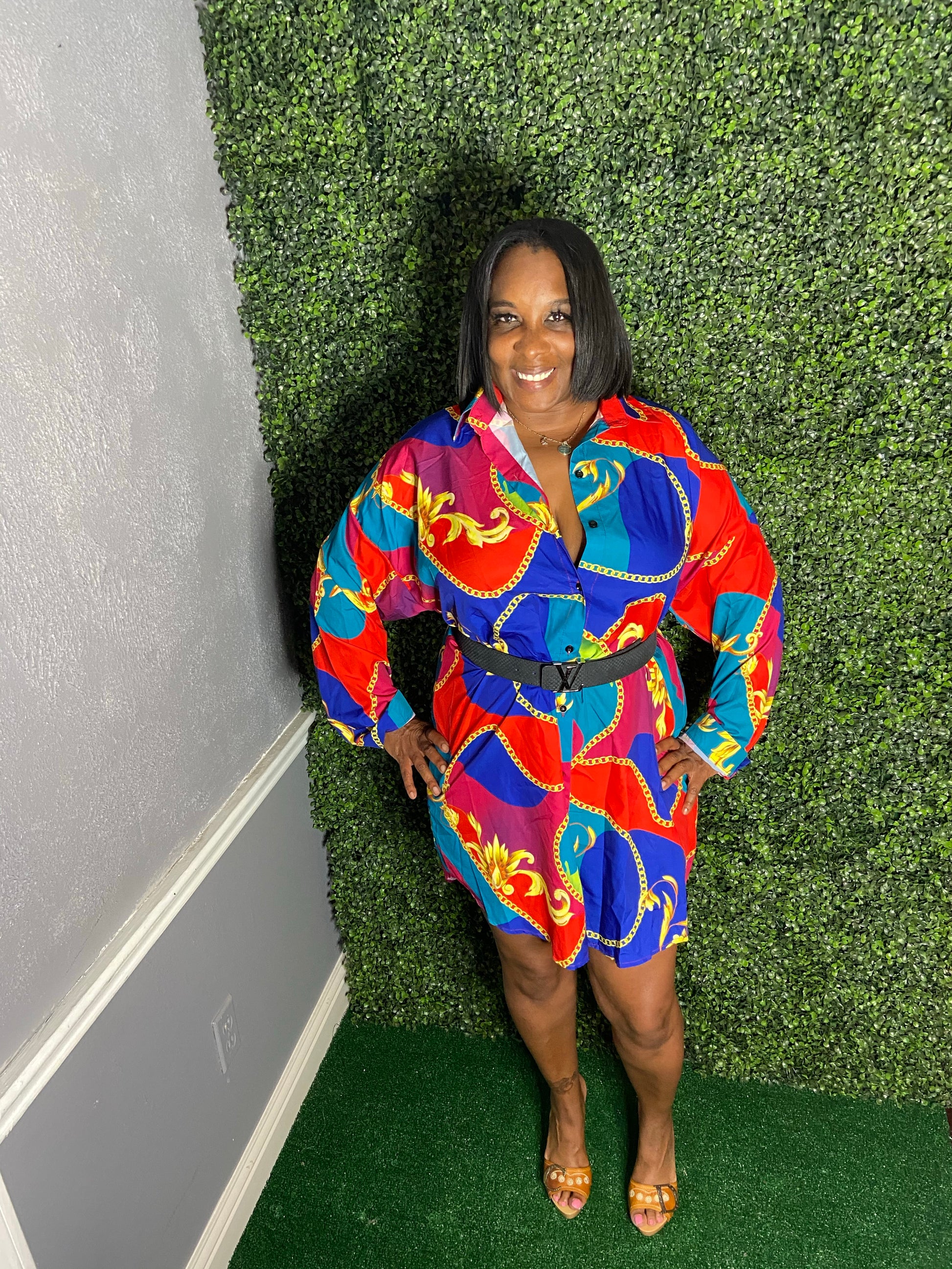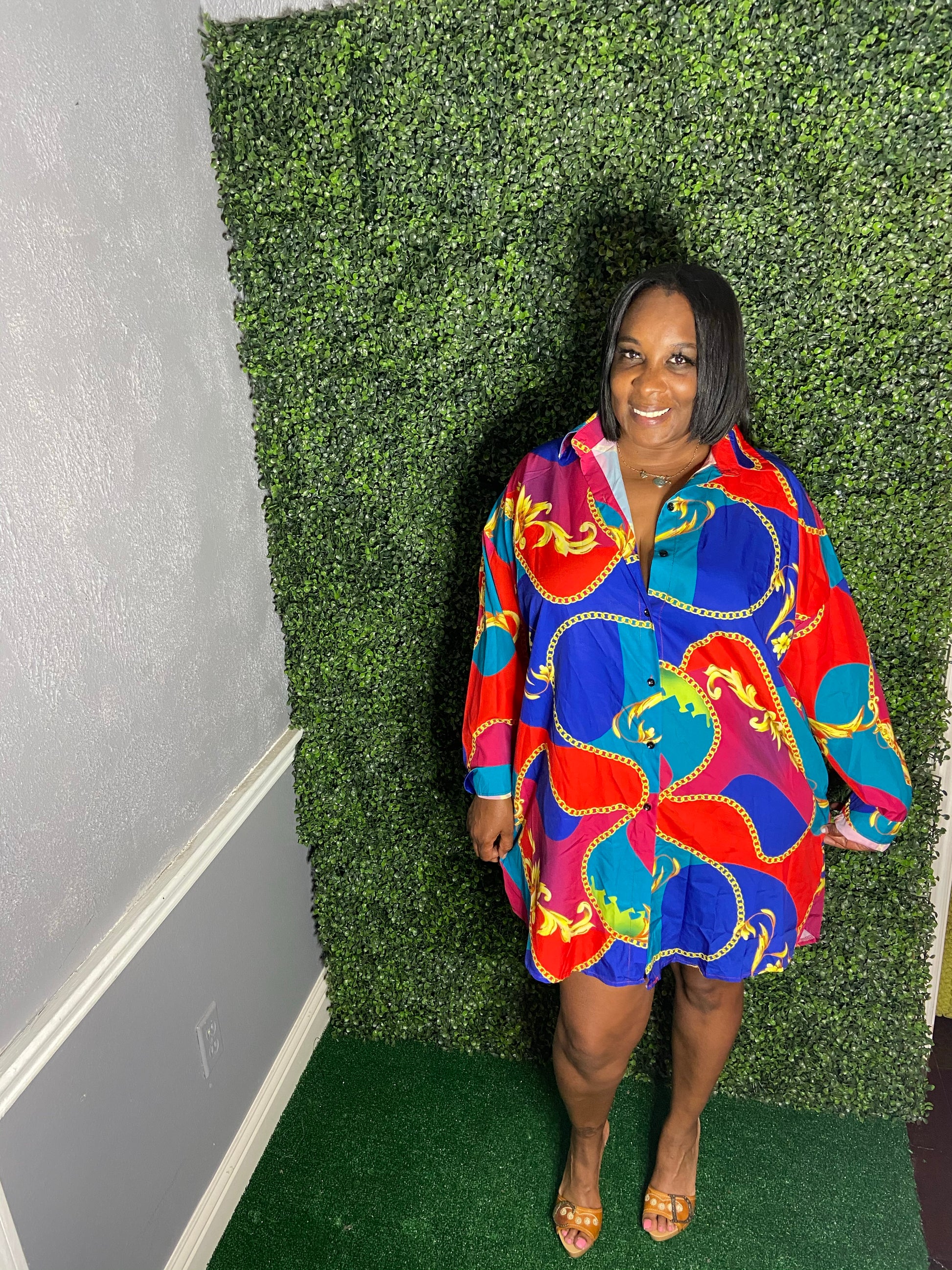 Oversized shirt dress with buttons up the front & at the wrist .