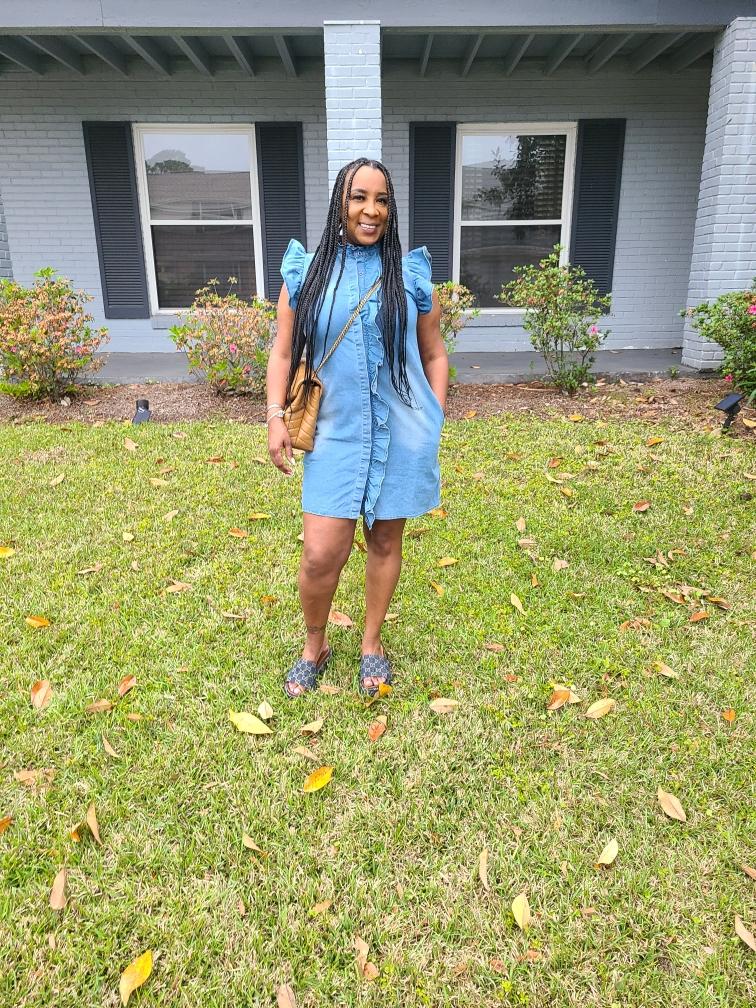 Denim shirt dress button up the front side pockets . Denim ruffle sleeve & down the front over the buttons