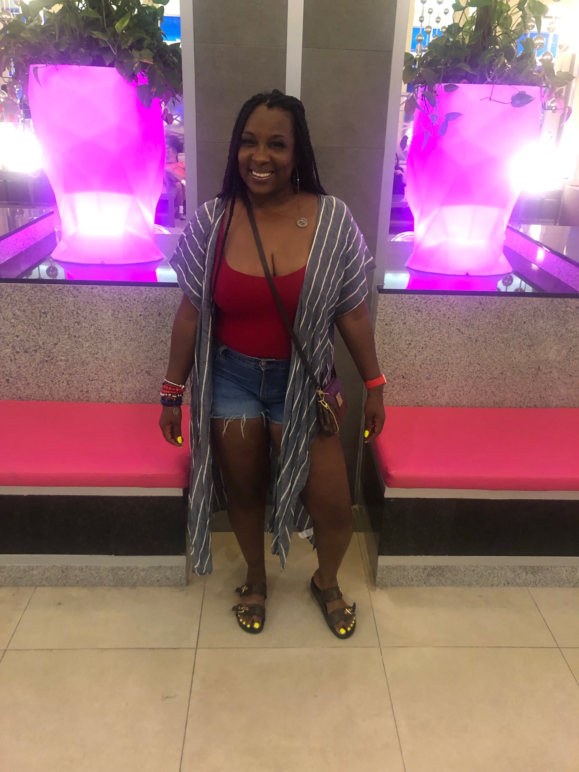 Denim kimono with white stripes & four splits.