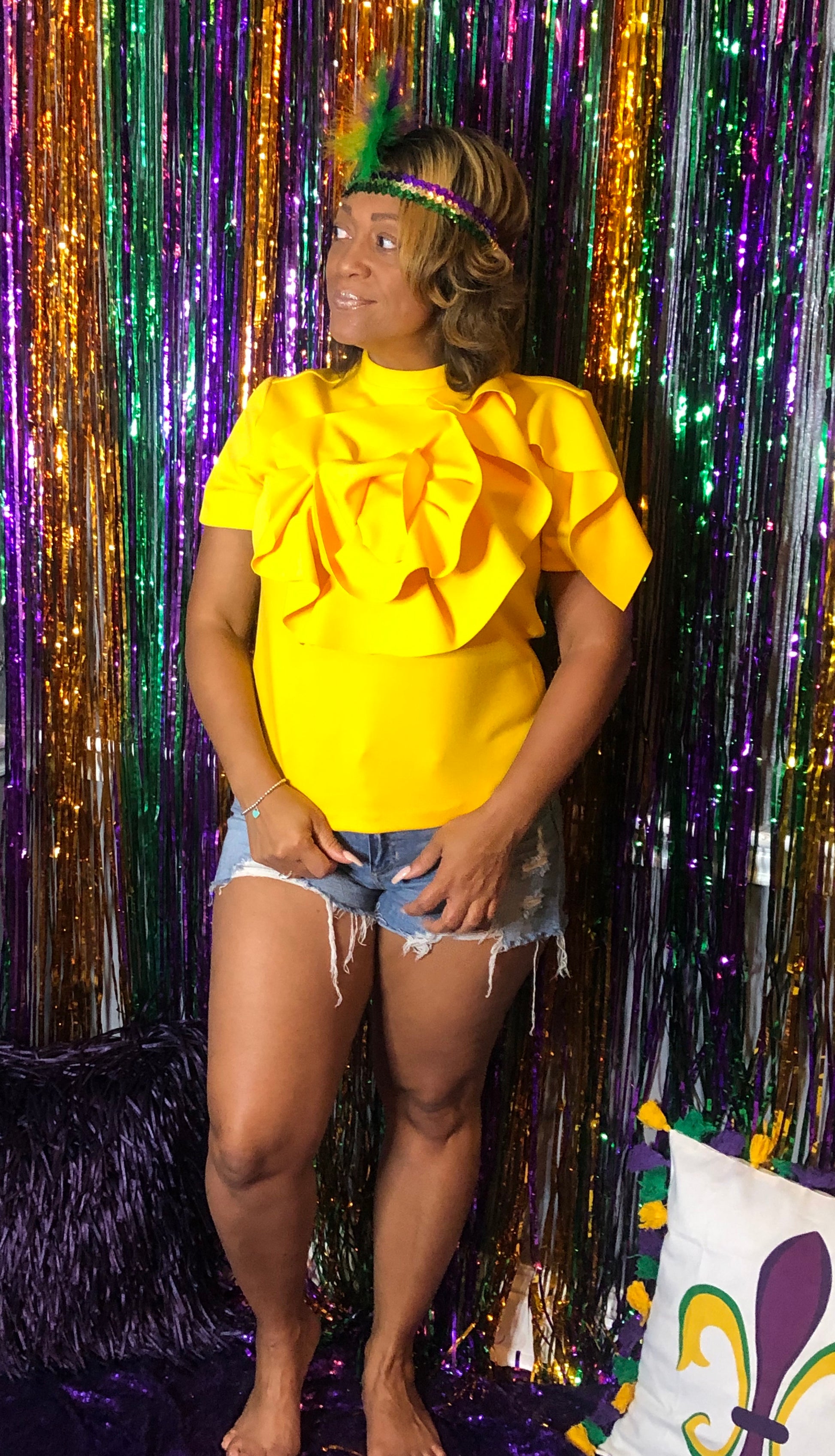 Great stretch. Light scuba with flower detail on the front. Zip up by the neckline on the back great for Mardi Gras
