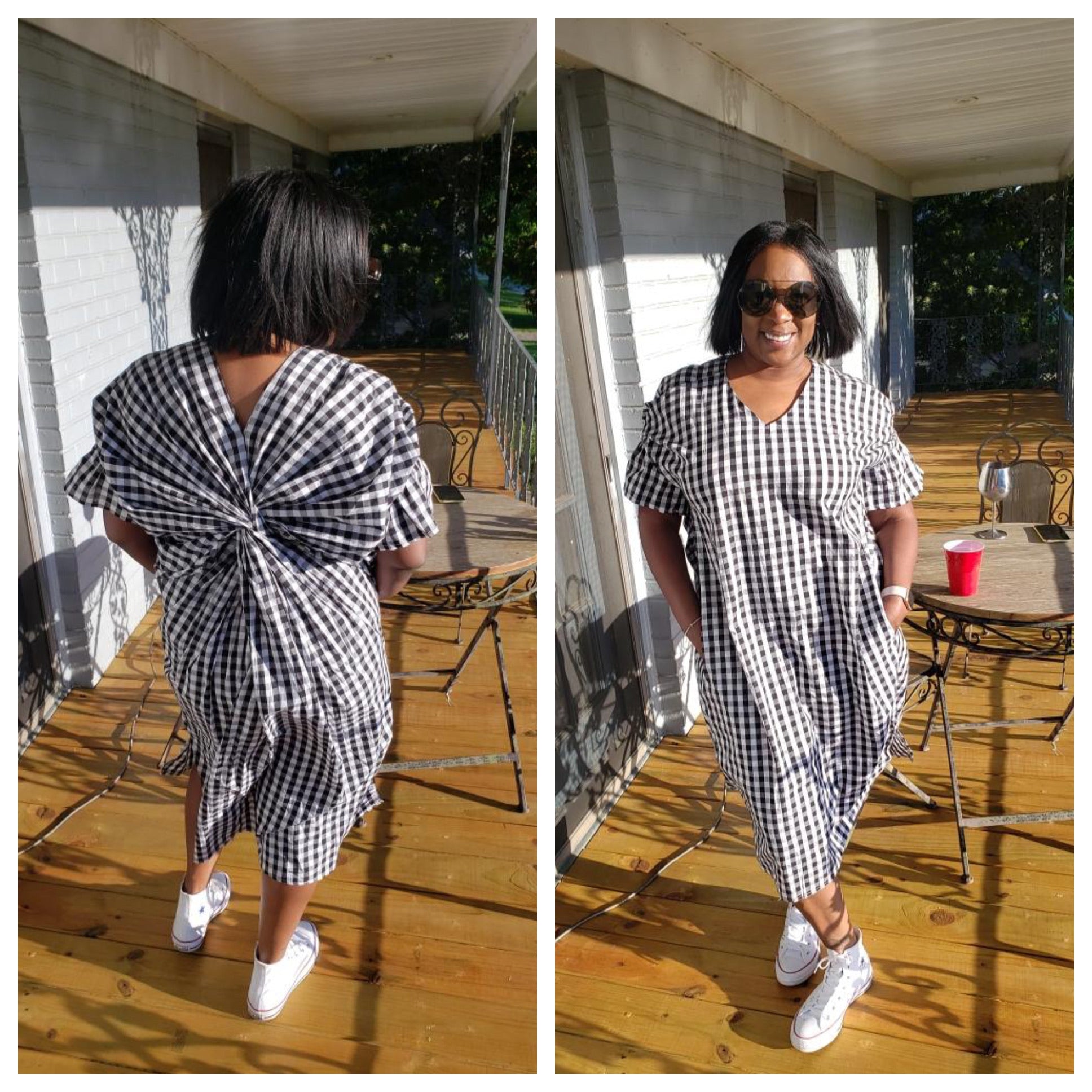 black & white gingham dress . With the look of a bow in the back. Side pockets & puff sleeve. Oversize